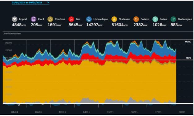 < Parc nucléaire français en temps réel > : la puissance fournie par chaque réacteur d’EDF et des informations concernant les arrêts de tranches passés et futurs.
